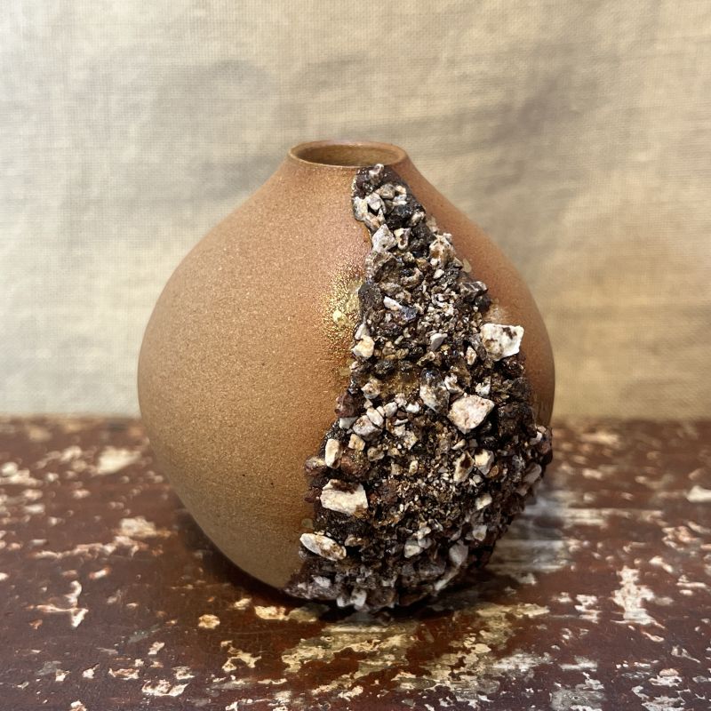 Chyběla mi v mé tvorbě surovost a hrubost přírodních materiálů. A tak jsem si řekla, jak nejlépe zkombinovat jemný precizní tvar s kousky nadrcených minerálů? Na šálkách by mohl být hrubý povrch nepraktický, ale na vázičky se mi skvěle hodil. A tak vznikla tato kolekce, kombinující jemnost s hrubostí, uspokojující mou i Vaší potřebu po hmatatelné přítomnosti přírody.