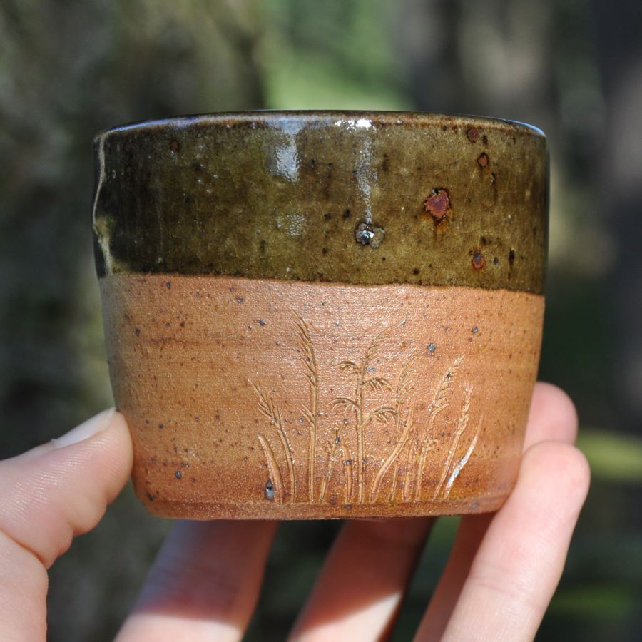 Kalíšek pálený na vysoké teploty v peci na dřevo. Vyroben kompletně z neupravených přírodních materiálů - jak hlína, tak glazura. Lehce vybublal, takže nemá dokonale rovné dno. Zato rozhodně má vlastní charakter :)