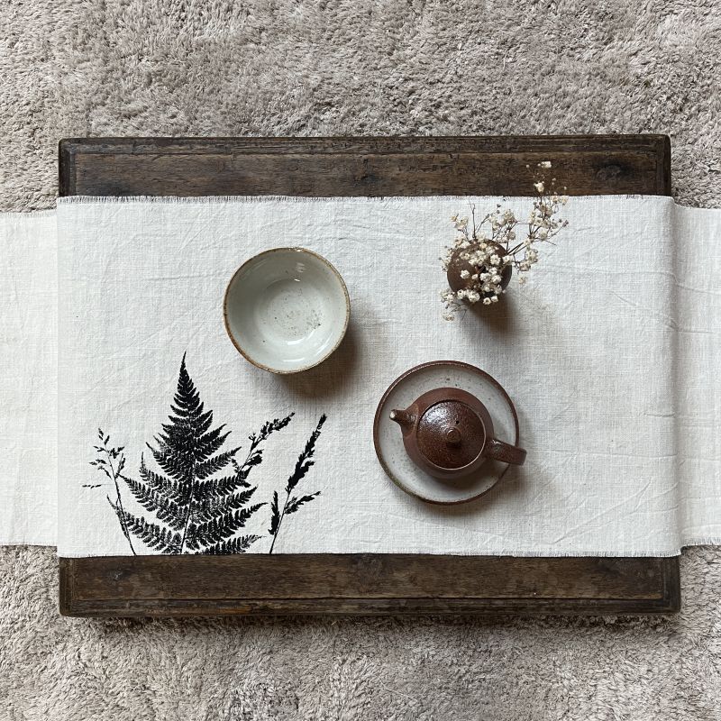 Ručně potištěný český len v krásném světlém odstínu. Okraje má přírodní, takže se časem mohou více třepit. Není dokonalé - jak ruční potisk, tak jeho tvar jsou v duchu wabi-sabi. Světlá barva se při polití čajem může obarvit, čímž si vytvoříte svou vlastní jemnou přírodní batiku a chabu se bude časem krásně proměňovat.