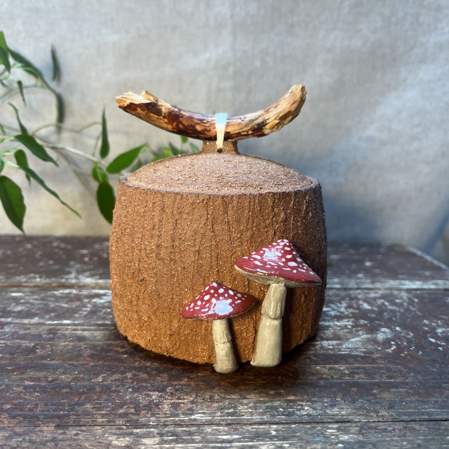 Cukřenka má díru na klasickou čajovou lžičku. Držáčkem je větvička nalezená v pošumavském lese. Byla vyrobena z hrubší hlíny, takže doporučuji ji nešoupat přímo po stole, abyste si nepoškrábali povrch :)