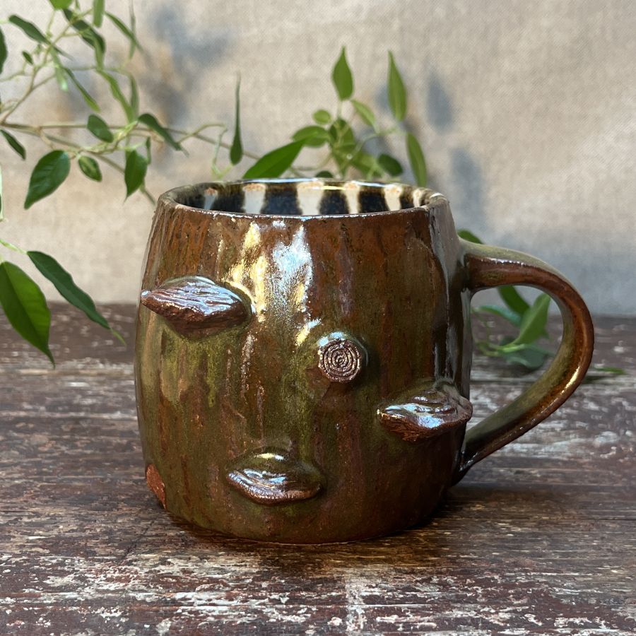 Hrnek pálený v peci na dřevo, s bílou glazurou uvnitř a zeleno-hnědo-flekatou zvenčí. Vyrostly na něm choroše.