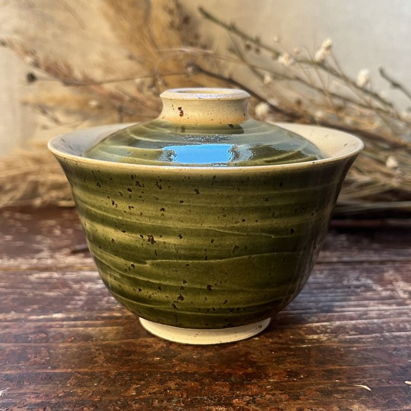 Gaiwan má objem 105 ml a je celkově robustnější. Když ho předehřejete, bude dobře držet teplotu, avšak nepatří k nejlehčím. Zevnitř je glazován světle, takže v něm krásně uvidíte barvu čaje. Zvenku ho zdobí tmavá lesní zelená.